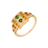 La bague Ambra en vermeil or 18 carats est une création exclusive de la marque ANÄU Paris. Elle a été conçue sur la base d’une monture symétrique en double escalier, typique du style graphique Art Déco. Le duo de pierres rondes au centre est accompagné d’une mosaïque de pierres fines aux couleurs transparentes. L’ensemble des pierres est serti griffes et rehaussé d’une finition millegrain afin d’ajouter une touche rétro séduisante à cette bague d’exception.