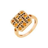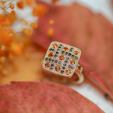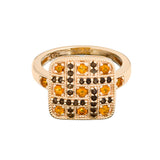 La bague Montella est fabriquée de manière artisanale. Elle se compose d’un anneau et d’un plateau en vermeil or 18 carats. L’anneau est souligné par deux pierres rondes serties grains. Le plateau carré est un damier en or superposé de pierres fines, le tout serti millegrain pour cultiver un air rétro. Les gemmes sont assorties en un duo graphique qui marie au choix topazes et tourmalines, quartz fumé et spessartites, ou bien des tourmalines bicolores, créant ainsi une bague originale, aux variations uniques et changeantes.
