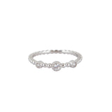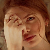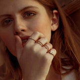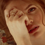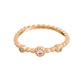 Bague en vermeil or 18 carats jaune ou rose, ou en argent rhodié perlée et composée de trois zircons sertis au centre de la bague. Cette bague de la collection minimaliste peut se porter seule pour un look chic et en accumulation avec d'autres bagues pour un look plus trendy.