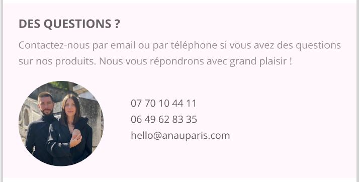 Pour connaître la procédure à suivre afin de nous renvoyer votre bijou, contactez-nous par téléphone au +33 (0)7 44 40 98 42 ou par email à l'adresse suivante : hello@anauparis.com.
